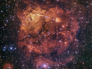 A cluster of young stars at the heart of the “smiling cat” nebula generates torrents of radiation that ionise surrounding gas, creating a vast reddish-orange nebula.